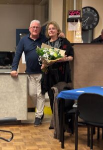 Natuurlijk wordt zij gefeliciteerd door onze voorzitter van B.C. Je Coupe, Harm van der Veen en krijgt zij een mooi boeket bloemen.